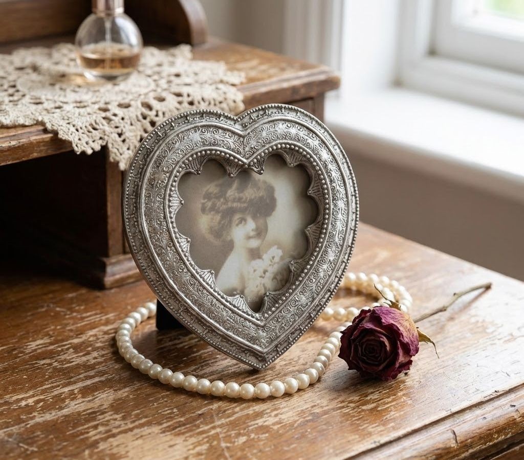 Rámeček zaujme na první pohled svým tvarem srdce a precizním zpracováním. Povrch v odstínu starostříbra je záměrně upraven patinou, která zvýrazňuje bohaté reliéfní zdobení. Okraje rámečku lemují jemné ornamenty a perličkové detaily, které krásně odrážejí světlo a přitahují pozornost k vložené fotografii.