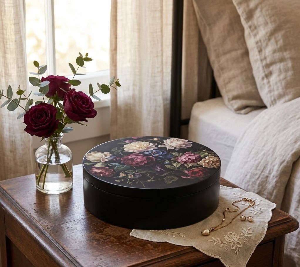 Tento krásný kulatý úložný box spojuje funkčnost s uměleckým designem. Je vyroben z kvalitní překližky, která zajišťuje lehkost a zároveň odolnost. Dominantou celého kousku je víko s podmanivým, detailním motivem rozkvetlých růží. Květy v hlubokých, tlumených tónech (bordo, starorůžová, žlutohnědá) na temně černém pozadí vytvářejí sofistikovaný a dramatický dojem, který okamžitě upoutá pozornost.