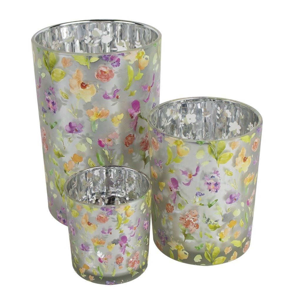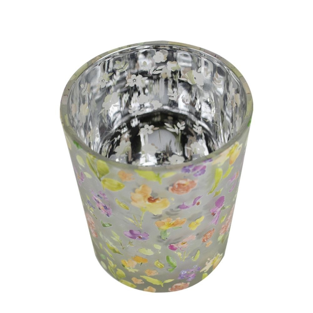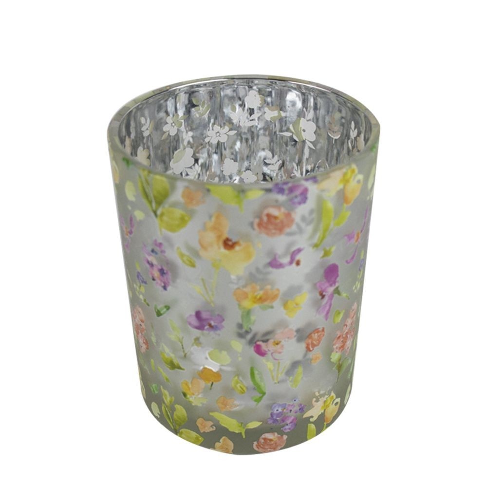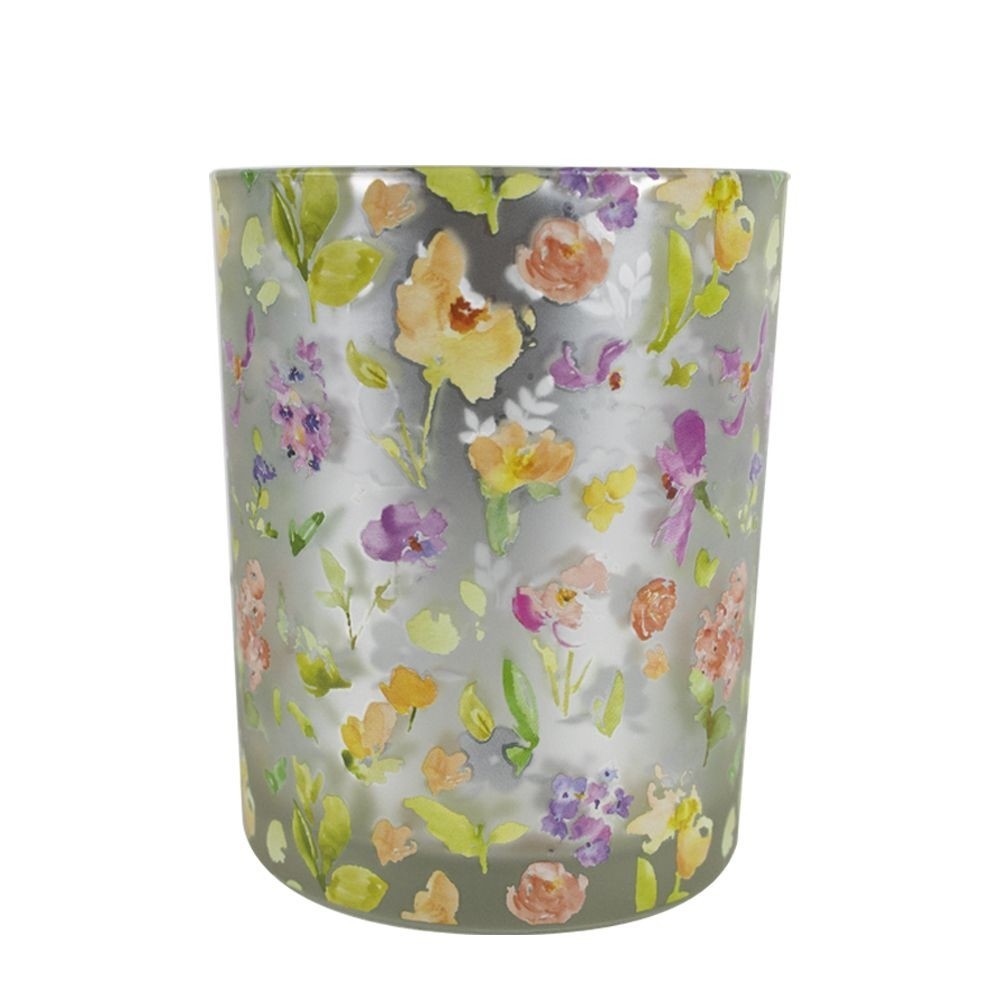 Šedý skleněný svícen s barevnými květinami M - 10*10*12cm