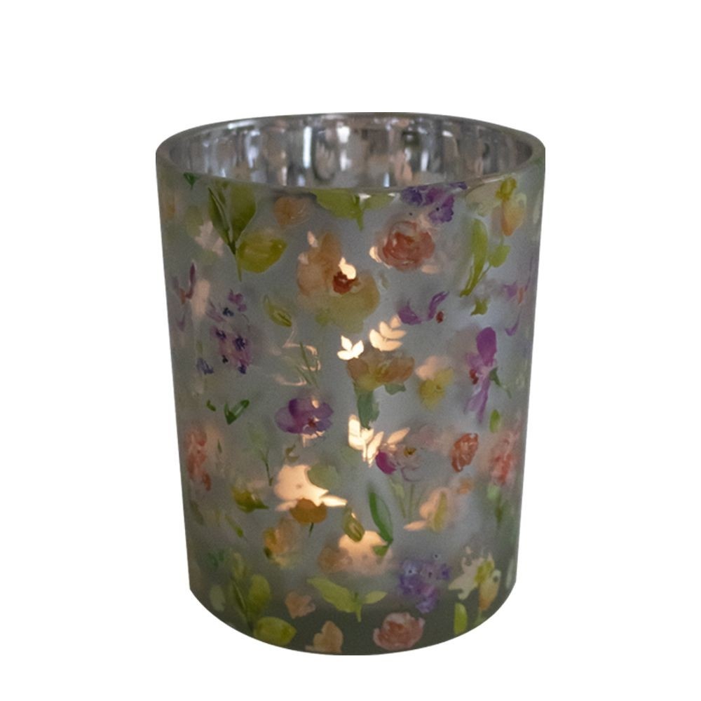 Šedý skleněný svícen s barevnými květinami bude zajímavým dekorativním prvkem na vašem stole nebo komodě. Po zapálení svíčky navodí romantickou atmosféru v pokoji.