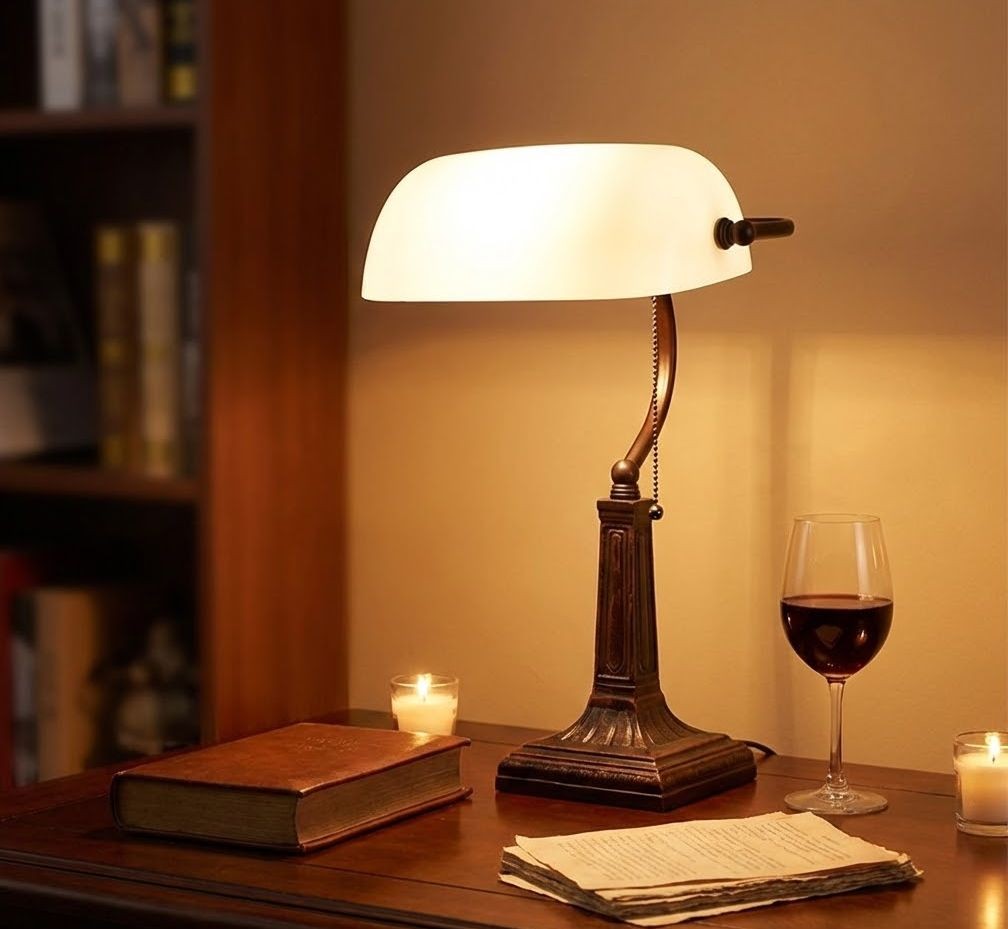 Krásná designová bankovní lampa bude praktickým pomocníkem vašeho stolu. Zajímavé designové řešení polyresinu, kovu a zeleného opálového skla dělá lampu skvostem.