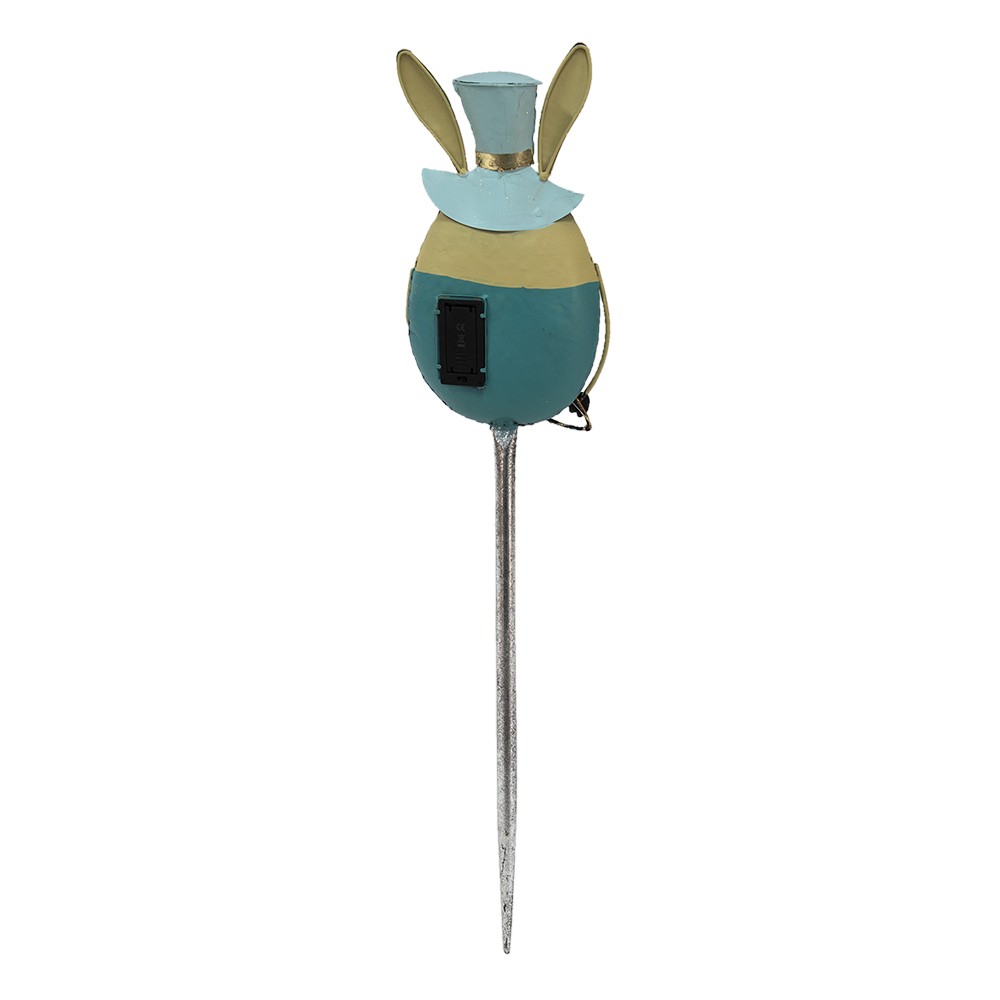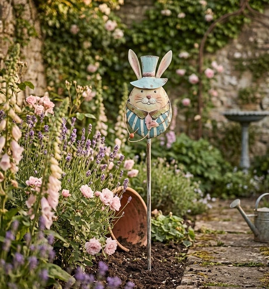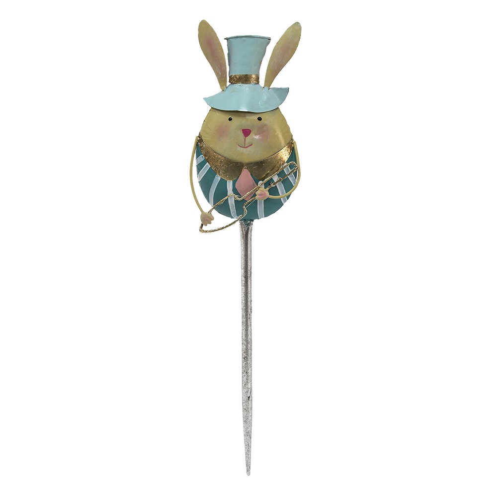 Králíček je vyveden v jemných pastelových tónech s převažující nebesky modrou barvou. Elegantní vysoký klobouk (cylindr), pruhovaný obleček a roztomilý výraz s jemnou patinou mu dodávají jedinečný vintage šmrnc. Díky dlouhému a pevnému zápichu jej snadno umístíte přesně tam, kam potřebujete, a bude stabilně držet na svém místě.