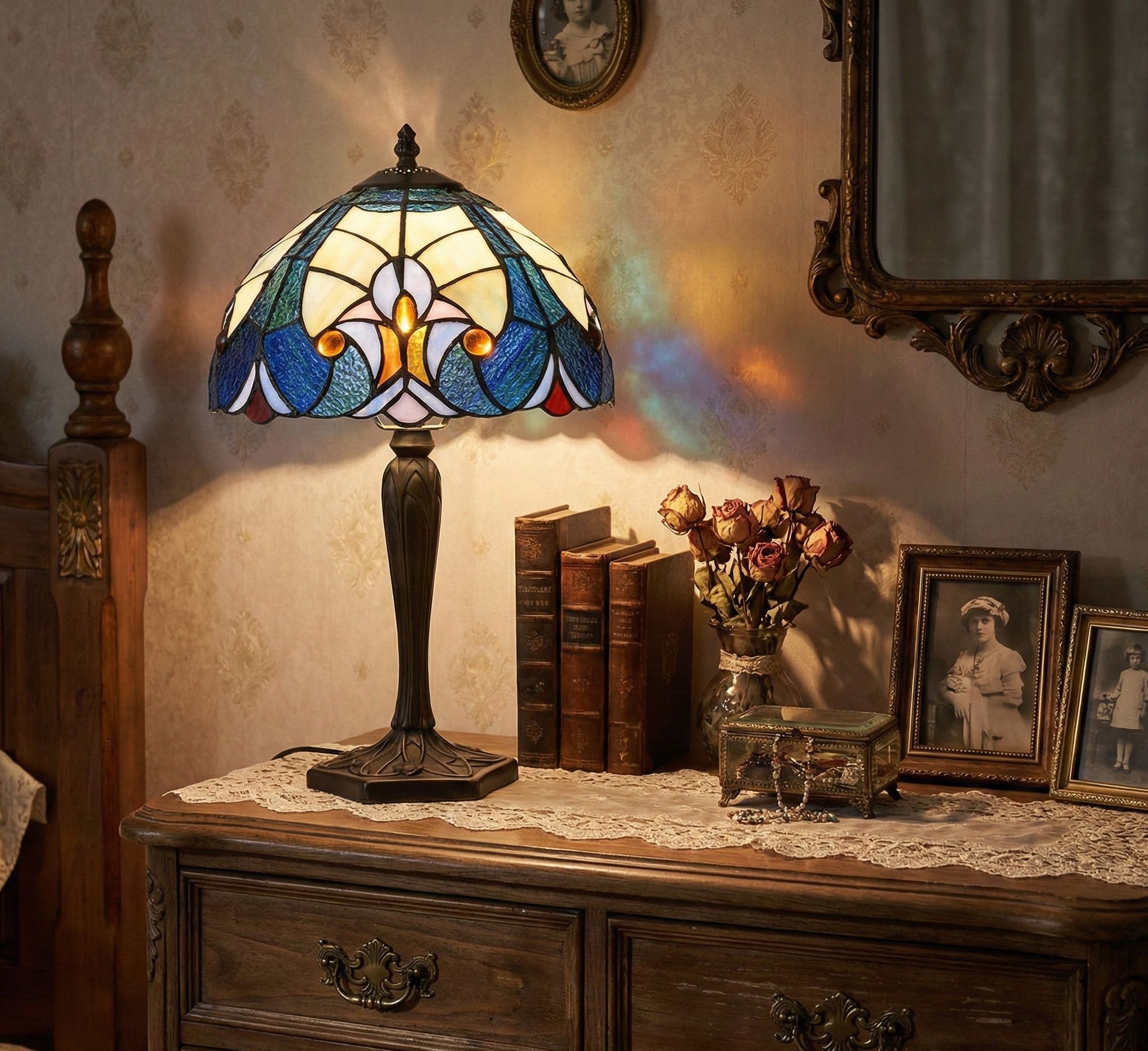 Tato jedinečná stolní lampa Tiffany je skvělým doplňkem každého interiéru. Její barevné dílky vytvářejí krásný klasický vzor, kterým ozdobíte vaše prostředí. Noha lampy je vyrobena z vysoce kvalitního polyresinu, což jí dodává pevnost a odolnost.