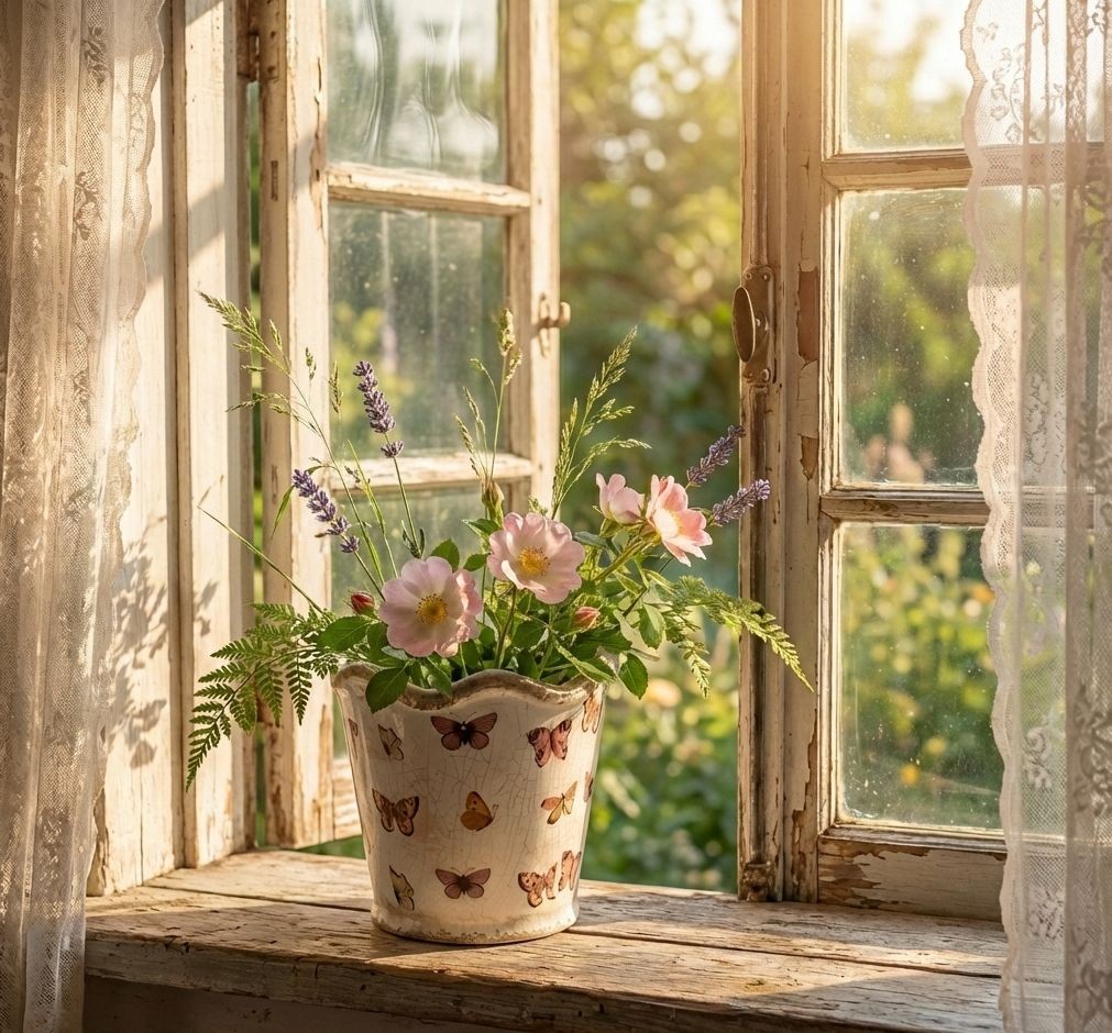 Přineste si do svého domova přírodu s barevným vzorem motýlků a romantickým stylem tohoto úchvatného béžového keramického květináče.