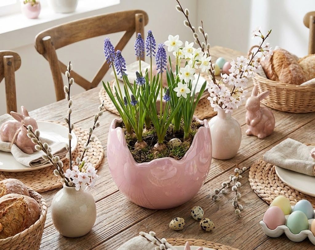 Jarní květiny: Vložte dovnitř malý květináč s modřenci, hyacintem nebo primulkami. Zelená barva listů v kontrastu s růžovou skořápkou krásně vynikne.