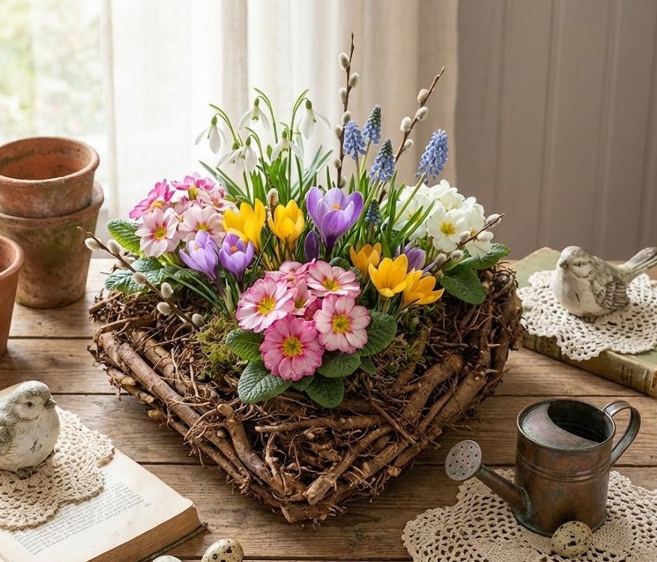 Díky svému designu můžete tento květináč snadno umístit na stůl, parapet nebo terasu, kde rozzáří vaše jarní aranžmá.