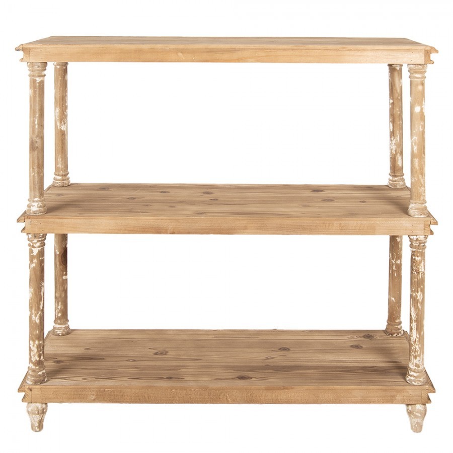 Tento stylový třípatrový regál na první pohled zaujme svým detailním zpracováním. Dominantou jsou krásně soustružené sloupky v bílé odřené barvě s výraznou umělou patinou, která nábytku dodává žádaný vintage či "shabby chic" vzhled. Tento světlý základ elegantně kontrastuje s přírodně hnědými dřevěnými policemi, na kterých nádherně vyniká přirozená kresba a struktura dřeva.