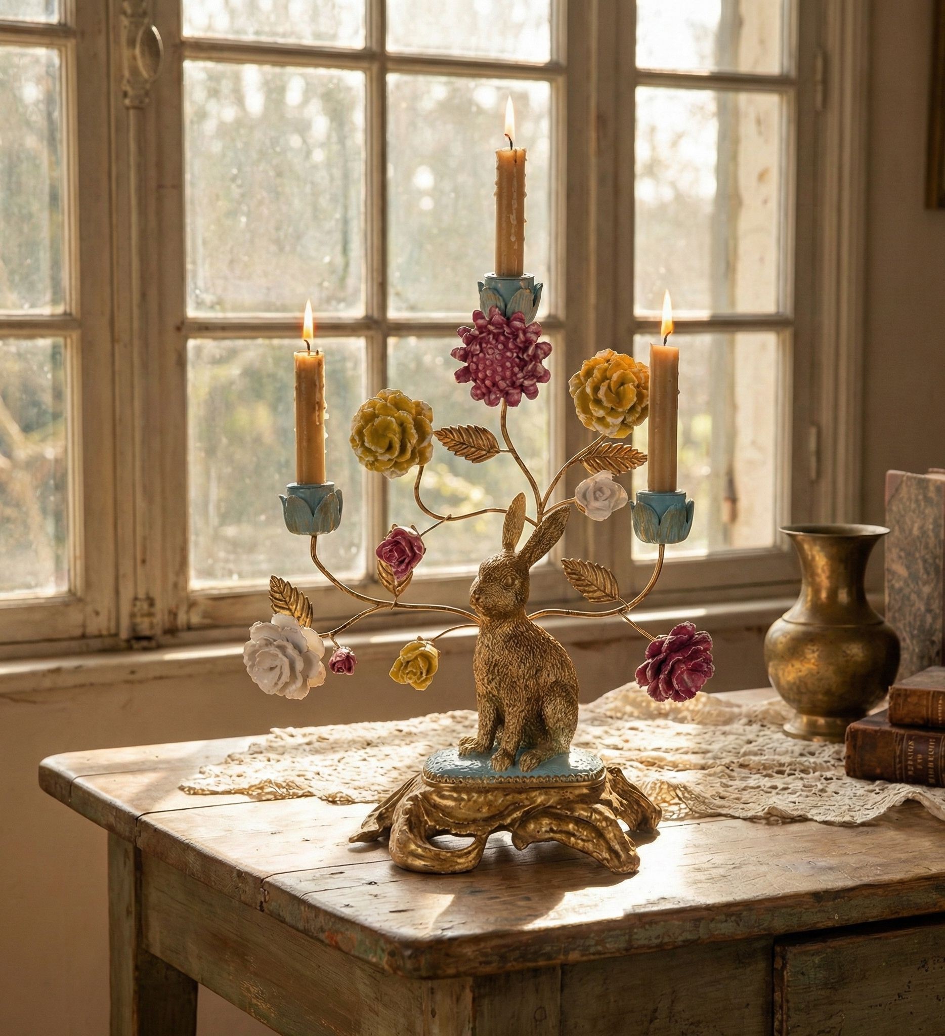 Představujeme vám nádherný svícen králík na podstavci s květy, který se stane středobodem vaší velikonoční výzdoby. Tento elegantní svícen je navržen pro tři svíčky o průměru 2 cm a je zdoben půvabným zlatým králíkem, který symbolizuje radost a obnovu.