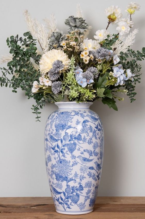 Její jemné modré květy a hravé ztvárnění ptáčků vytváří harmonický kontrast, který oživuje každý interiér. Vyrobena z kvalitní keramiky, vyniká trvanlivostí a snadnou údržbou, což z ní dělá ideální volbu pro každou místnost.