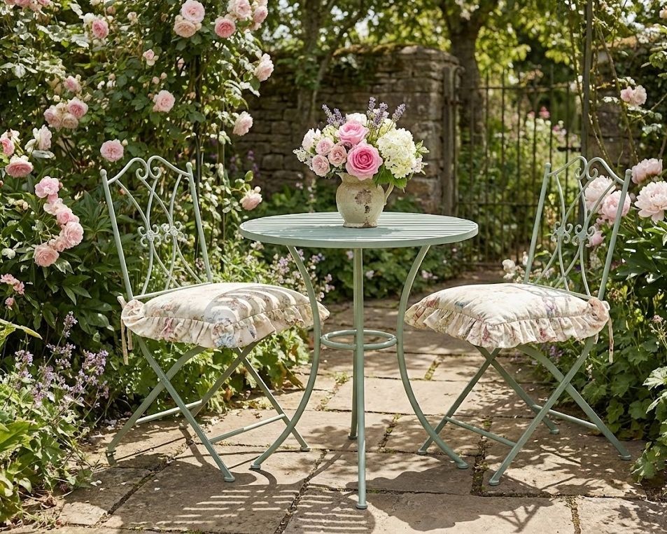Vneste na svou zahradu, terasu či balkon špetku francouzského šarmu s naší zahradní soupravou Evelin. Tento elegantní bistro set v jemném odstínu antik zelené je dokonalou volbou pro ty, kteří hledají spojení praktičnosti a romantického designu.