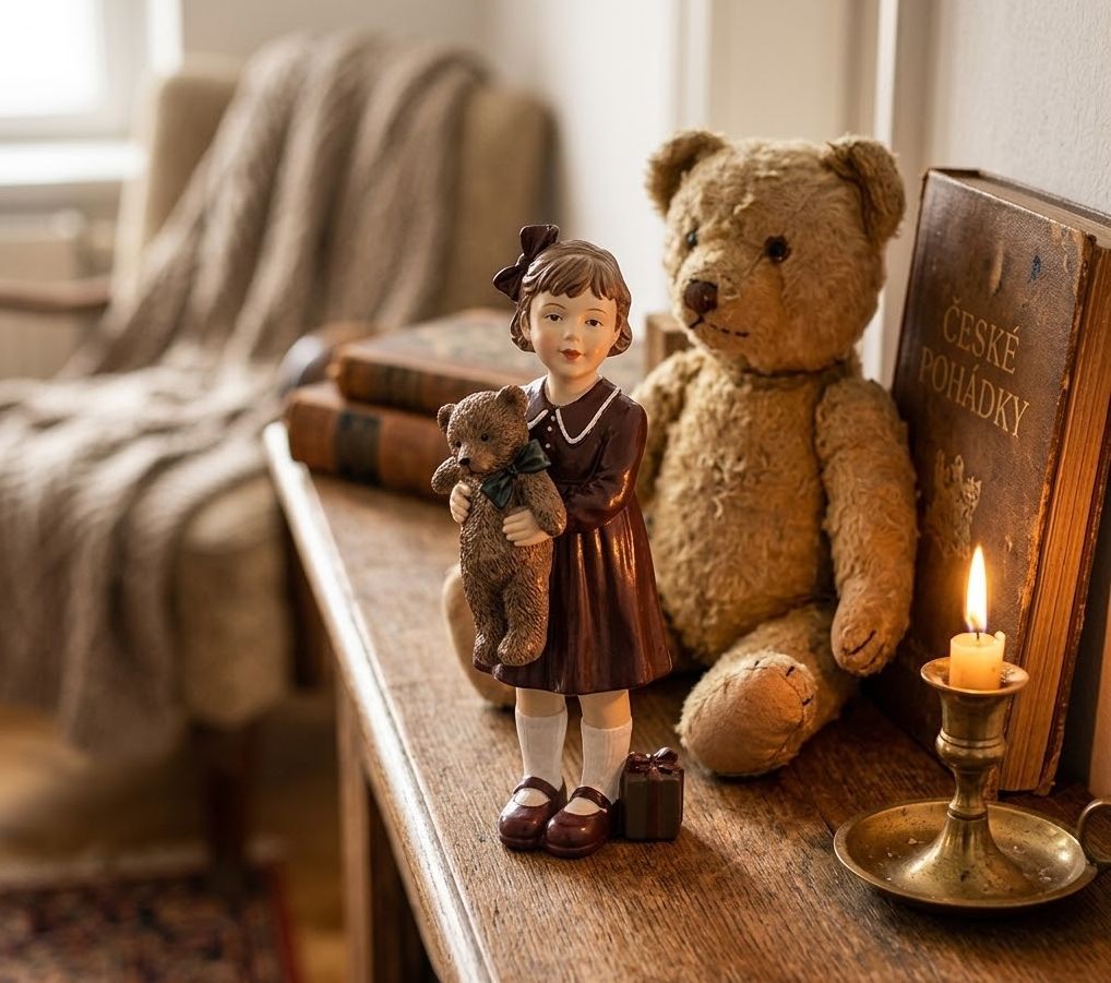 Kouzlo v každém detailu Figurka vyobrazuje malou holčičku oblečenou v elegantních vínových šatičkách s jemným bílým límečkem, bílými podkolenkami a sladěnými botičkami. V náručí láskyplně svírá svého oblíbeného hnědého medvídka a u nohou jí leží drobný dáreček. Vintage vzhled podtrhuje i roztomilá mašle ve vlasech a precizní zpracování jemných obličejových rysů.