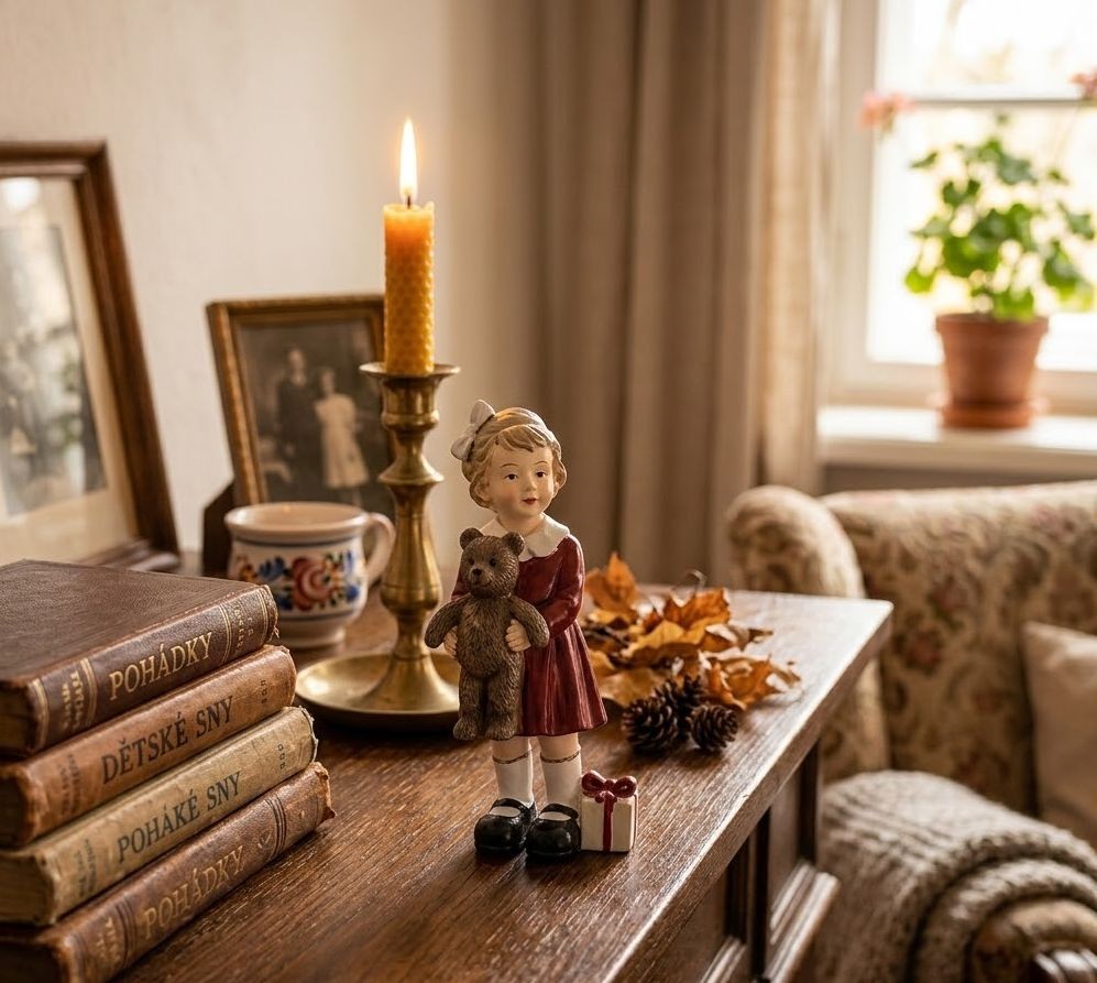 Kouzlo v každém detailu Figurka vyobrazuje malou holčičku oblečenou v elegantních vínových šatičkách s jemným bílým límečkem, bílými podkolenkami a sladěnými botičkami. V náručí láskyplně svírá svého oblíbeného hnědého medvídka a u nohou jí leží drobný dáreček. Vintage vzhled podtrhuje i roztomilá mašle ve vlasech a precizní zpracování jemných obličejových rysů.