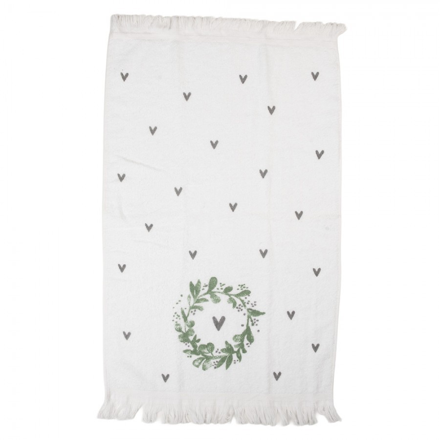 Dodejte své koupelně nebo kuchyni nádech romantiky a stylu s tímto krásným bílým froté ručníkem. Vyrobený z měkkého a savého froté materiálu, nabízí příjemný pocit při každém použití. Ručník je zdoben jemným vzorem malých šedých srdíček a výrazným motivem zeleného věnce s šedým srdcem a větvičkami ve spodní části. Třásně na okrajích mu dodávají jedinečný rustikální šarm. Díky svým kompaktním rozměrům 40*66 cm je ideální jako ručník na ruce pro každodenní použití. Tento ručník je nejen praktickým, ale i estetickým doplňkem, který zútulní váš domov.