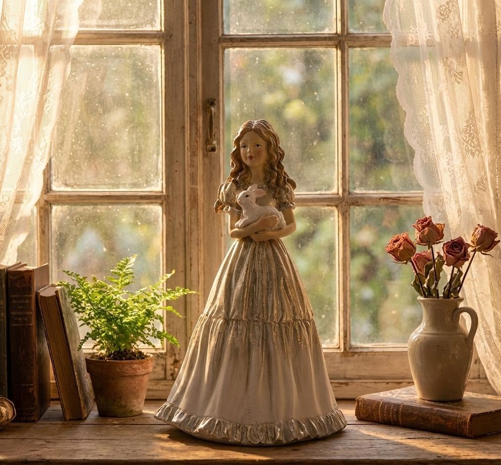 Oživte svůj interiér s jedinečnou béžovou dekorací dívky v šatech, která drží roztomilého králíčka.