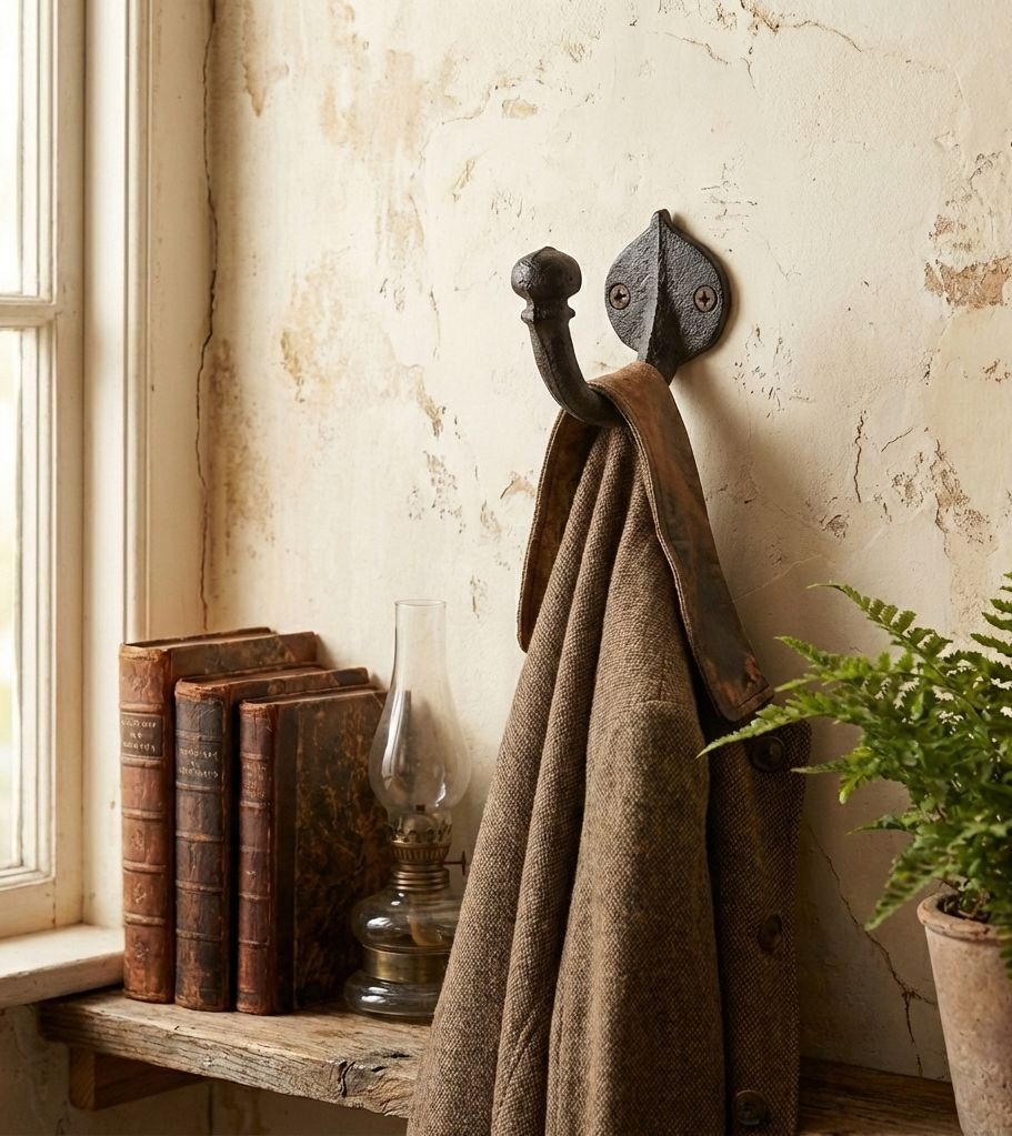Autentický vintage design: Tmavá, texturovaná povrchová úprava a ozdobná základna ve tvaru listu/erbu dodávají háčku přesvědčivý starožitný charakter. Ideální pro doplnění stylu Provence, retro, farmhouse nebo industriálního loftu.
