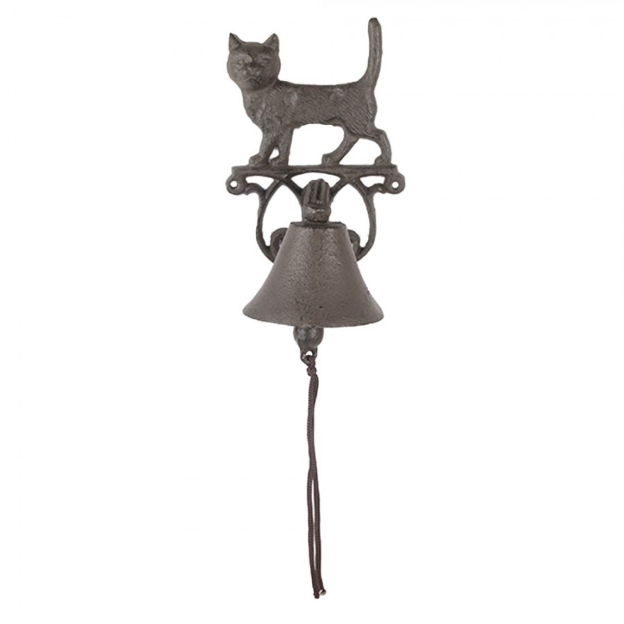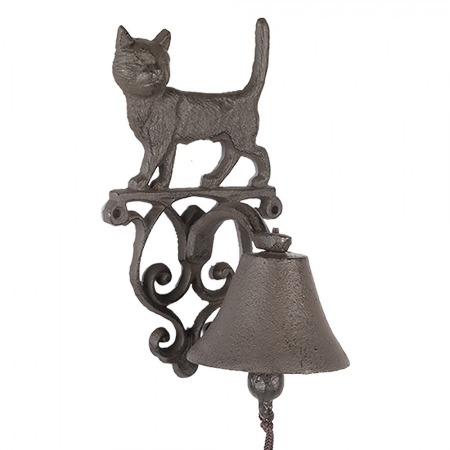 Krásný rustikální design: Tmavě hnědá patina a zdobná konzole s ornamenty dodávají zvonku autentický vintage vzhled. Vrchol konzoly zdobí stojící figurka kočky.