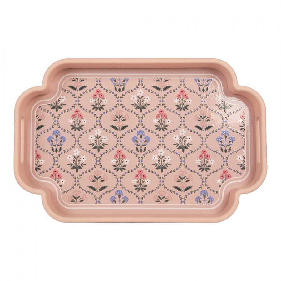 Větší podnos (Růžový): Je laděn do jemného pudrově růžového odstínu. Jeho dno zdobí celoplošný, detailně propracovaný květinový vzor v zámeckém stylu, který působí velmi něžně a harmonicky.