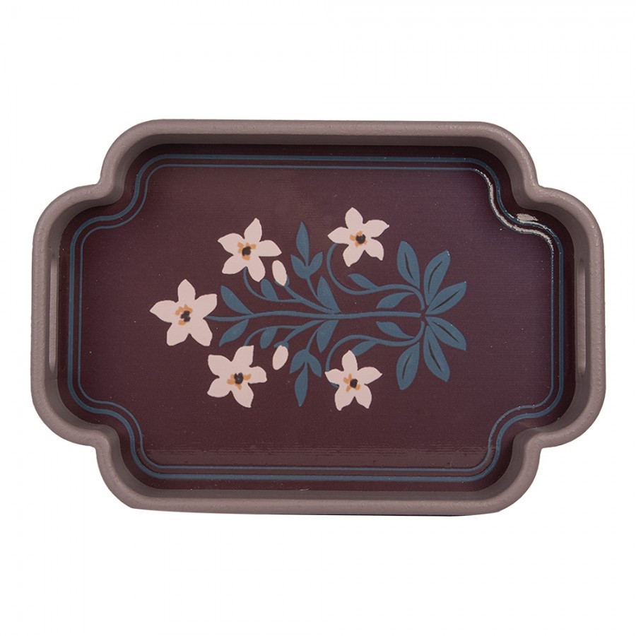 Menší podnos (Hnědý): Přichází v kontrastním tmavě hnědém (až čokoládovém) provedení. Dominantou je výrazný centrální motiv kytice bílých květů s modro-zelenými listy, který na tmavém podkladu krásně vynikne.