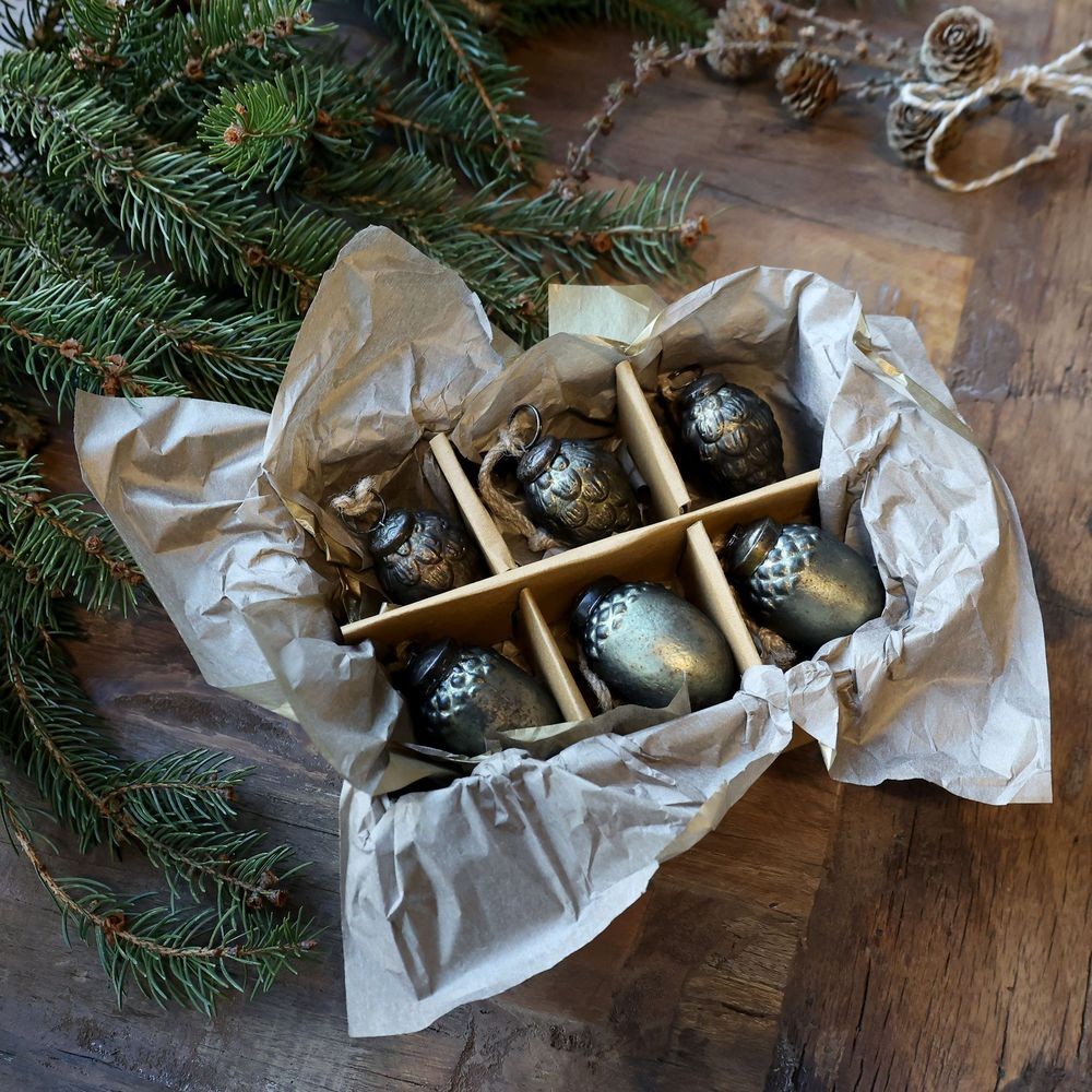 Připravte se na kouzelnou atmosféru Vánoc s naší jedinečnou ozdobou antik skleněnou vánoční v podobě šišky a žaludu. Ozdoba o průměru 3,5 cm a výšky 5,5 cm je perfektním doplňkem pro váš sváteční stromeček.