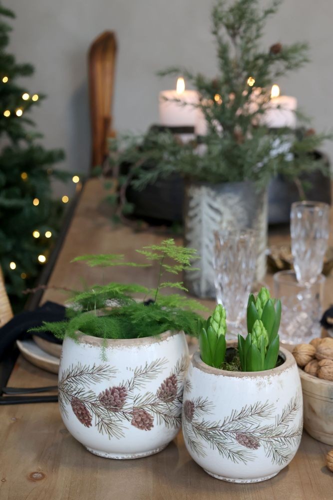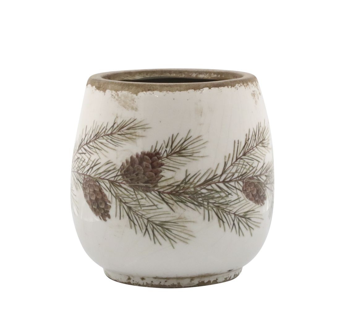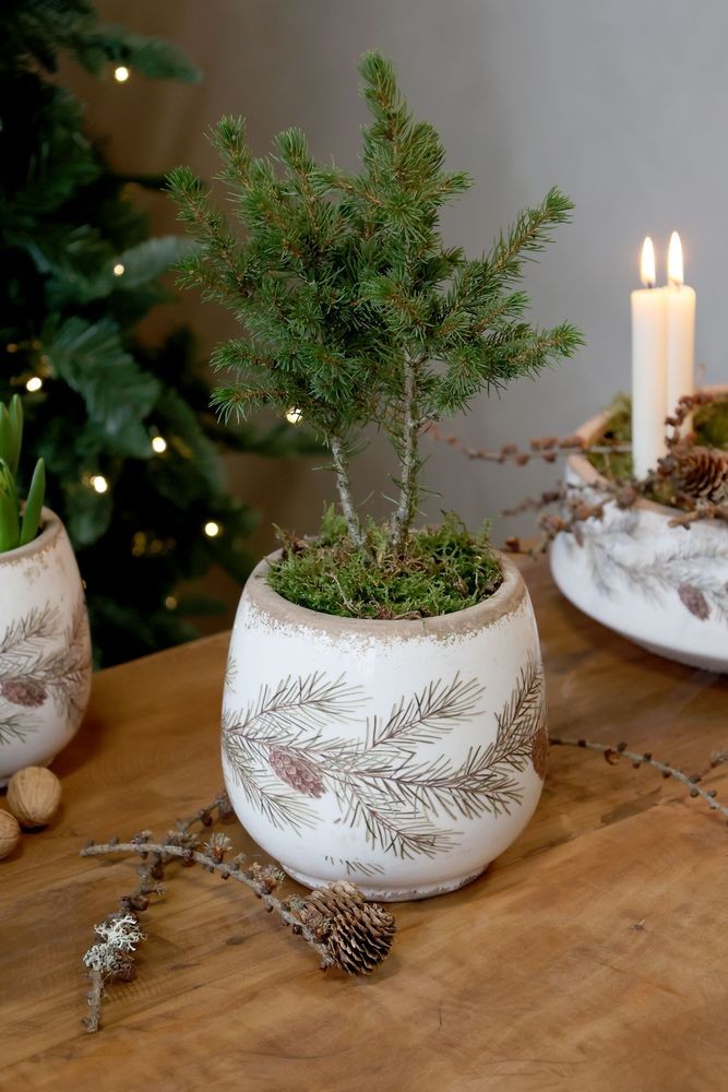 Objevte kouzlo tradičního designu s béžovým antik keramickým květináčem, který je zdobený elegantní jedlovou větvičkou.