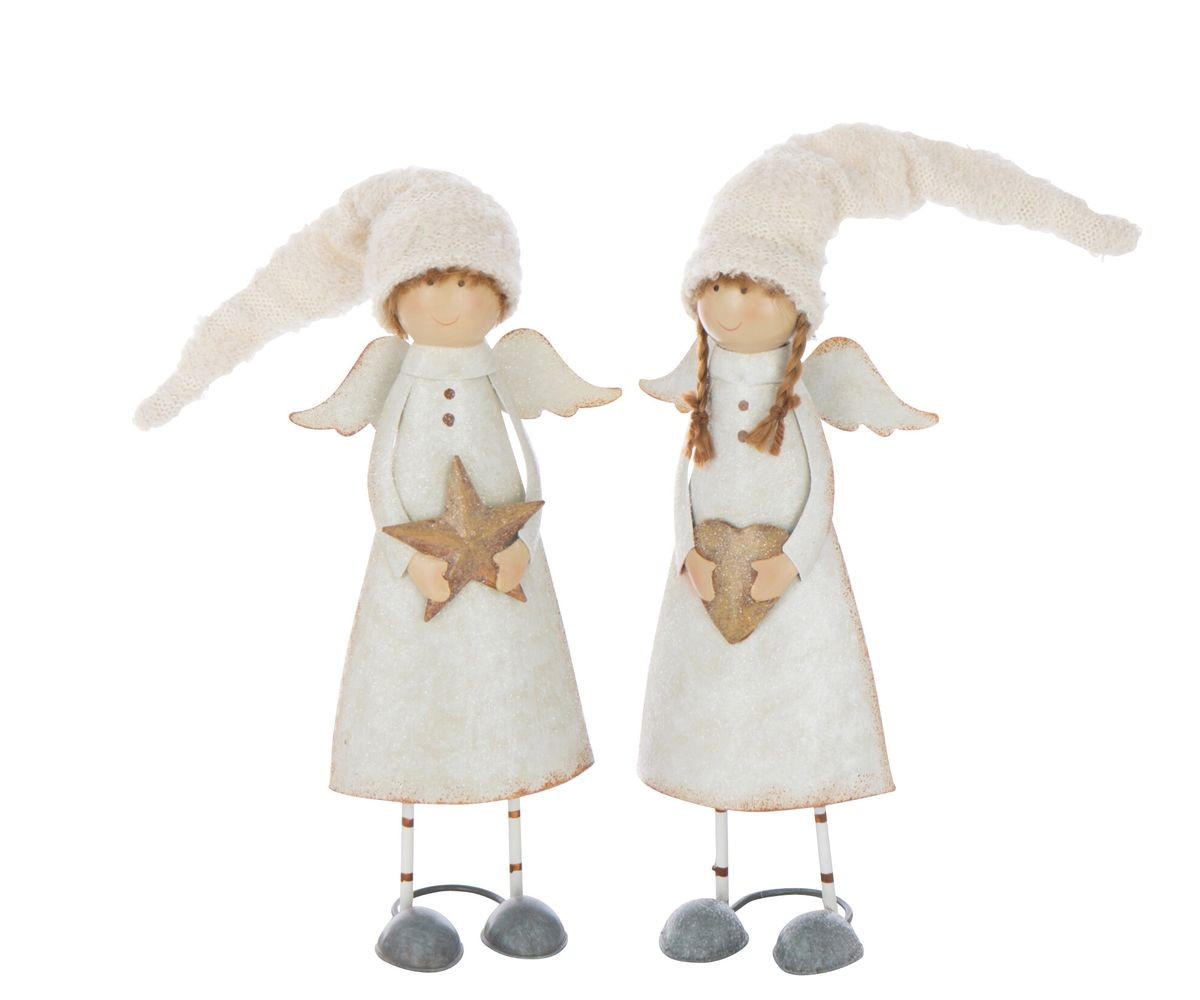 Představujeme vám okouzlující dekoraci, která vnese do vašeho domova kouzlo a útulnost - 2ks bílá antik kovová dekorace andílků s hvězdou a srdcem a plyšovou čepkou.