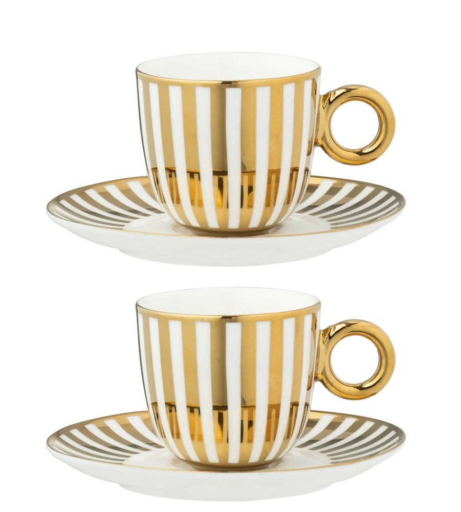 Objevte kouzlo elegance a stylu se setem 2ks bílého-zlatého pruhovaného šálku s podšálkem na kávu, který je obsažen v luxusní dárkové krabičce.