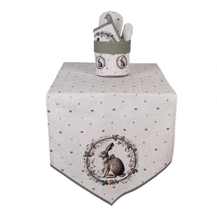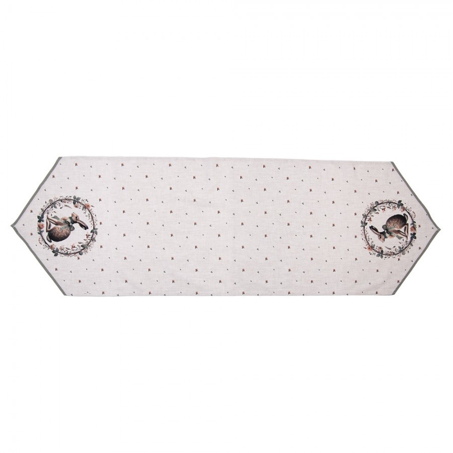 Dominantou tohoto kousku je romantický motiv zajíčka s mašlí uprostřed květinového věnce, který je umístěn na koncích běhounu. Běhoun je stylově zakončen do špičky, což mu dodává na eleganci a odlišuje ho od běžných obdélníkových textilií. Přírodní béžový podklad s jemným potiskem drobných lístků věrně imituje strukturu lnu a vnese do vašeho interiéru útulnou atmosféru francouzského venkova.