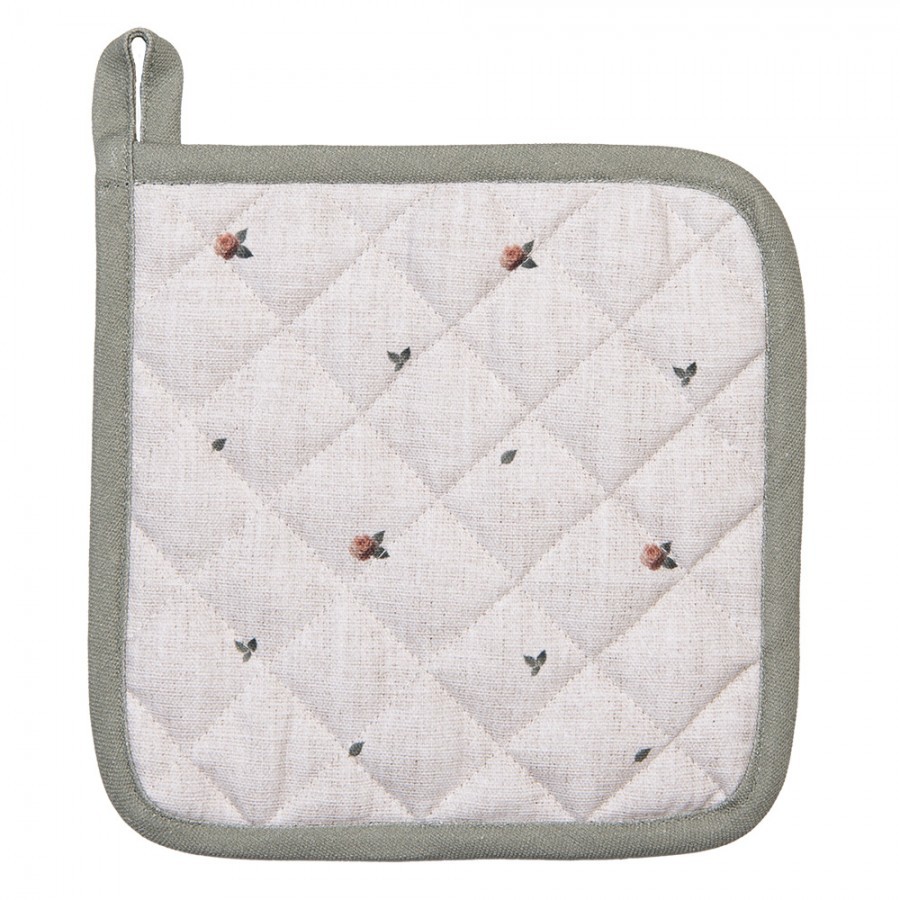Ústředním motivem je detailní ilustrace zajíčka s mašlí, usazeného v kruhovém květinovém věnečku. Přírodní béžový podklad krásně doplňuje decentní zelený lem, který rámuje celý obvod chňapky a dodává jí elegantní zakončení. Design věrně imituje strukturu lnu, čímž skvěle zapadá do venkovského či vintage stylu bydlení.