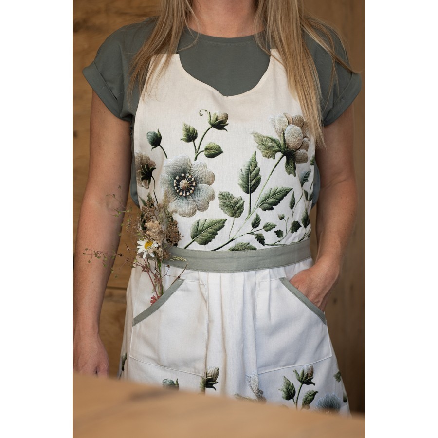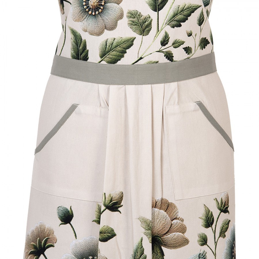 Designu vévodí nádherný květinový motiv v tlumených odstínech petrolejové, béžové a hnědé, který evokuje klidnou atmosféru rozkvetlé zahrady. Zástěra je propracovaná do posledního detailu – od ozdobného volánu ve spodní části až po kontrastní lemování v šedozelené barvě. Střih je navržen tak, aby lichotil postavě; řasení v pase dodává zástěře vzhled jemné sukýnky.