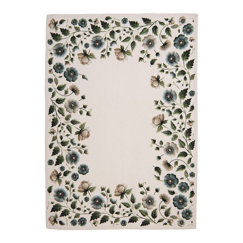 Designu dominuje elegantní květinový rám, který kombinuje tlumené odstíny modro-zelené (petrolejové) s jemnými béžovými a hnědými květy. Střed utěrky zůstává čistý, což dává vyniknout propracovanému okraji. Tento motiv se skvěle hodí do interiérů ve stylu Provence, rustikálních chalup i moderních kuchyní, kterým chybí trocha jemnosti.