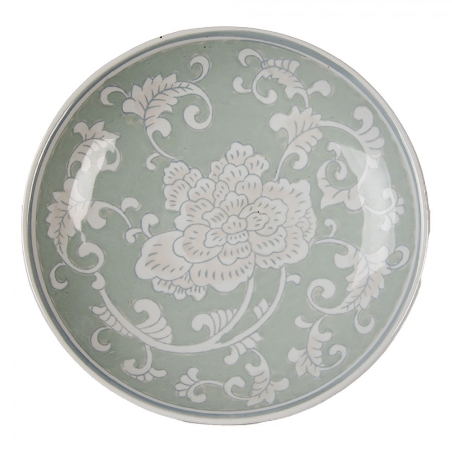 Mísa vyniká svým sofistikovaným šedozeleným podkladem (připomínajícím luxusní celadonovou glazuru), na kterém se rozprostírá bohatý, detailně propracovaný bílý florální vzor. Elegantní ornamenty zdobí nejen celou vnitřní plochu mísy, ale plynule přecházejí i na její stabilní podstavec.