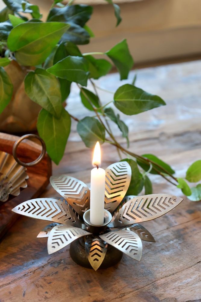 Objevte kouzlo a eleganci s mosazným antik kovovým svícnem na úzkou svíčku ve tvaru květu, který dokonale osvětlí každý kout vašeho domova.