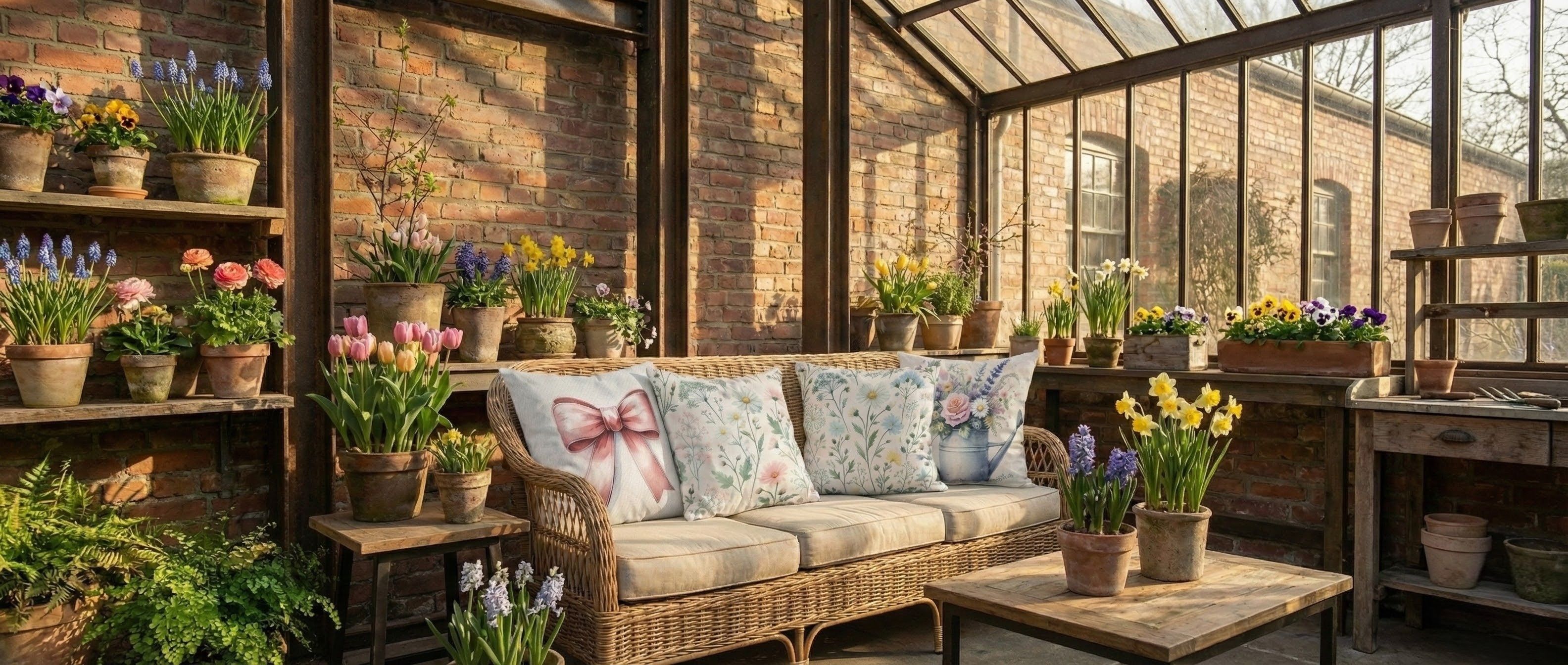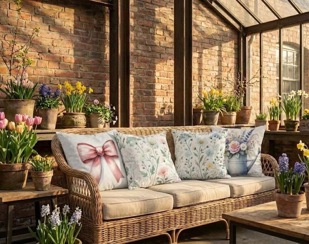 Přineste si do svého domova kousek jarní radosti s béžovým povlakem na polštář, který zdobí konvička s květy.
