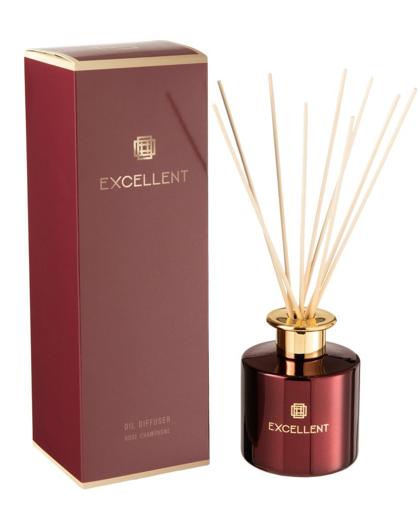 Objevte kouzlo elegance s interiérovým difuzérem vonného oleje Excellent Rose Champagne o objemu 150 ml. Tento luxusní difuzér je umístěn v nádherné skleněné baňce v atraktivní vínové barvě, která je doplněna jemnými zlatými detaily.