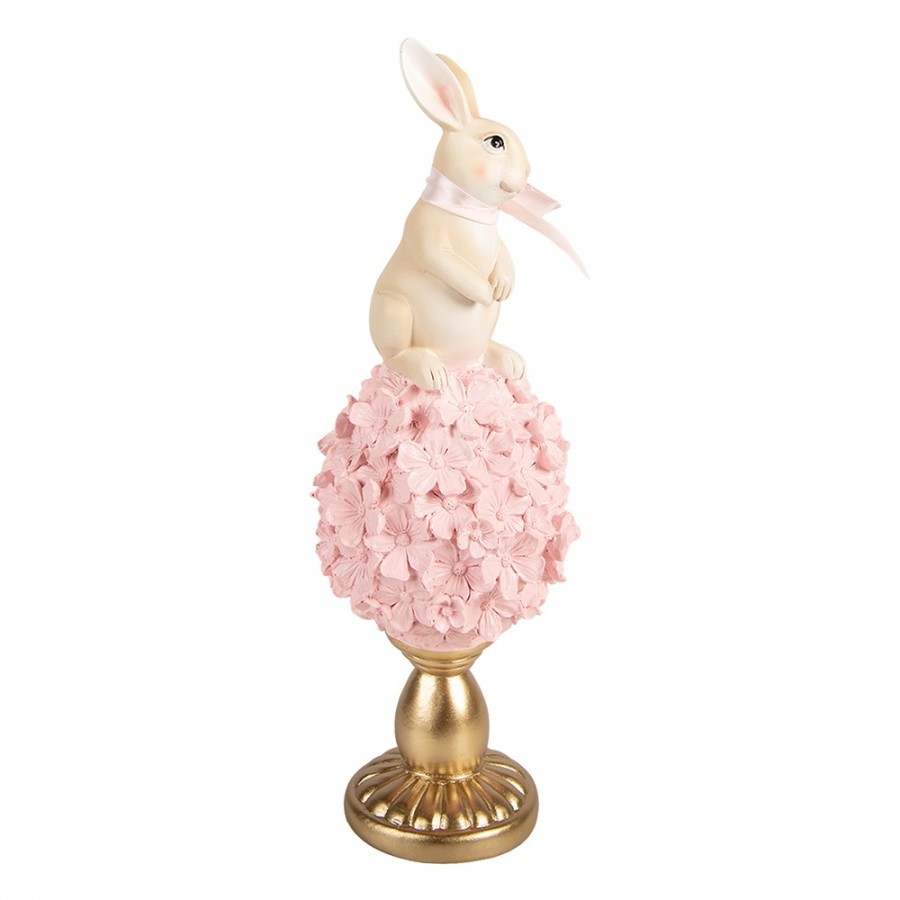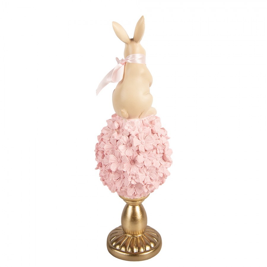 Kombinace materiálů a barev: Jemná pudrově růžová a krémová barva králíčka kontrastují s robustním zlatým podstavcem v antik stylu.