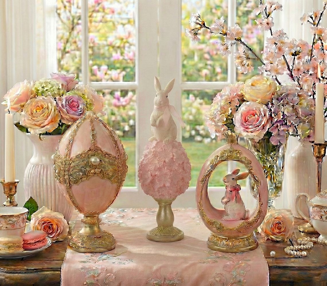 Vneste do svého domova svěžest rozkvetlé jarní zahrady v tom nejluxusnějším provedení. Tato unikátní dekorace o úctyhodné výšce 32 cm kombinuje něžnost růžových květů s elegancí zlatých akcentů. Na vrcholu bohatě rozkvetlého vajíčka trůní roztomilý králíček s mašlí, což z této figurky činí dokonalý středobod vaší jarní tabule.