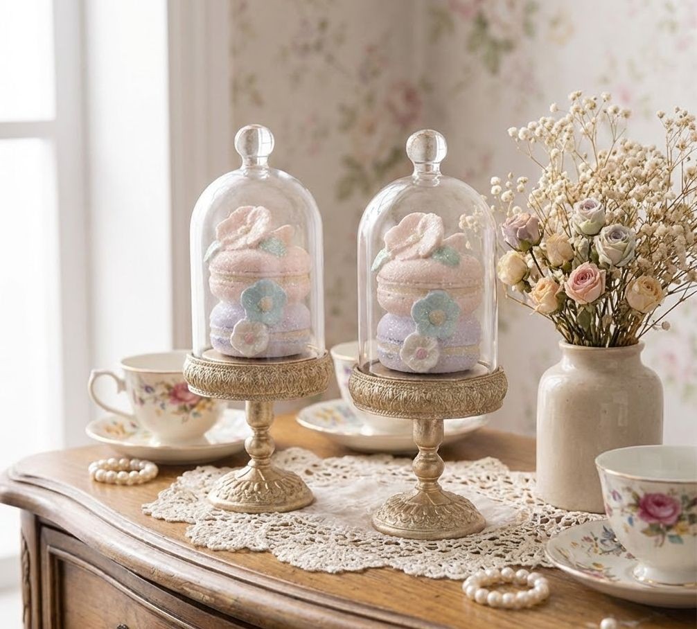 Přineste do svého domova špetku francouzské elegance a romantiky! Tato okouzlující drobná dekorace v podobě zdobeného zlatého podnosu ukrývá pod skleněným poklopem dvě pastelové makronky. Ideální a něžný doplněk pro milovníky vintage stylu, jarního ladění a sladkých detailů.
