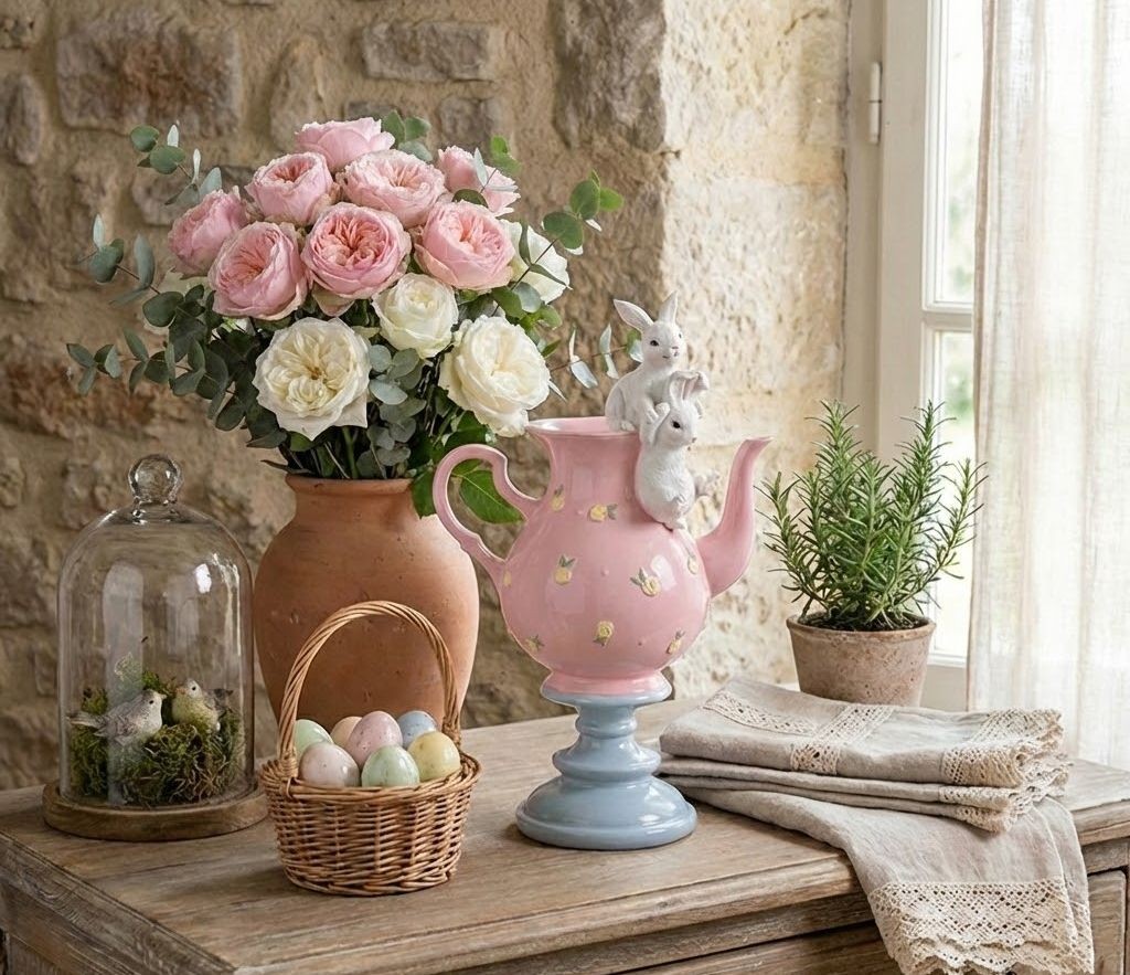 Hlavními hrdiny jsou však dva neposední bílí králíčci. Jeden vykukuje přímo z hrdla konvičky, zatímco druhý se k němu šplhá po jejím boku. Jejich hravá interakce vykouzlí úsměv na tváři každému, kdo projde kolem.