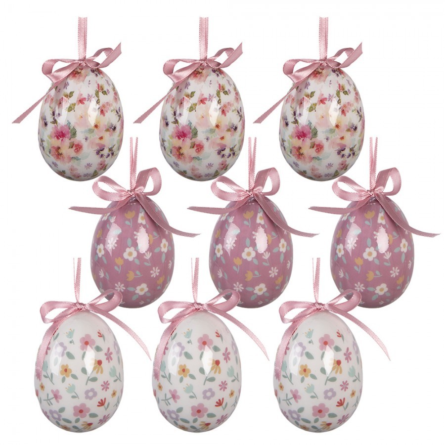 Vajíčka mají bílý podklad zdobený detailními, pestrobarevnými potisky lučních květů a růží, což jim dodává oblíbený vintage či Provence vzhled. Každé vajíčko je opatřeno jemnou růžovou stuhou, díky které je dekorování hračka.