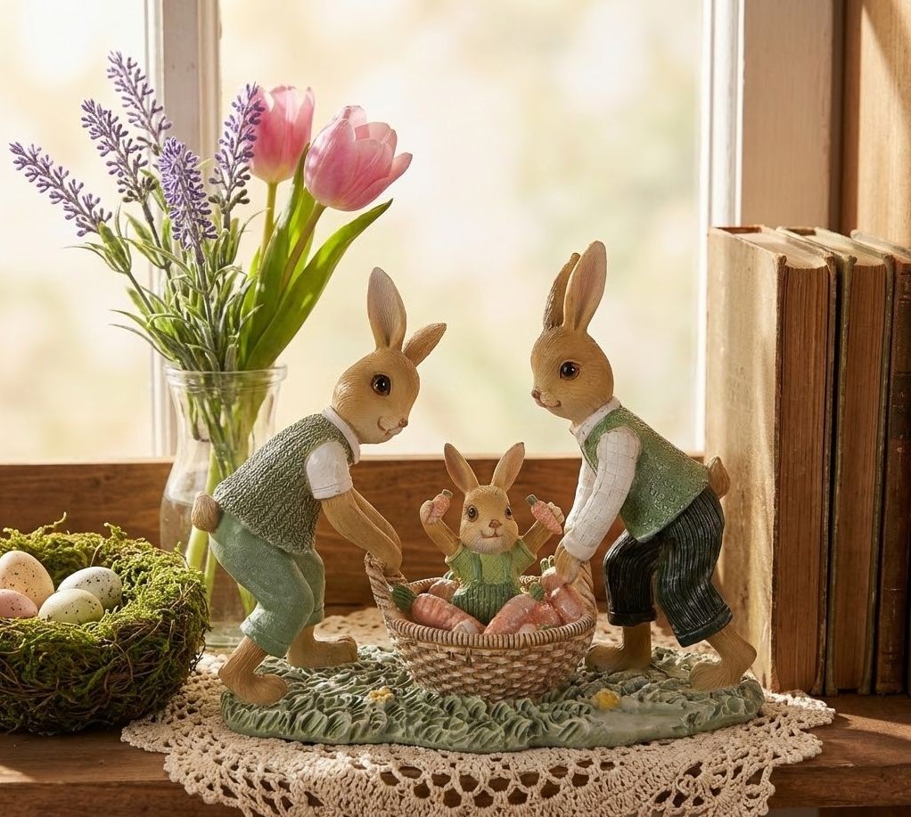 Dekorace králíci s košíkem s mrkvemi je okouzlující doplněk, který rozzáří každý interiér svým roztomilým vzhledem.