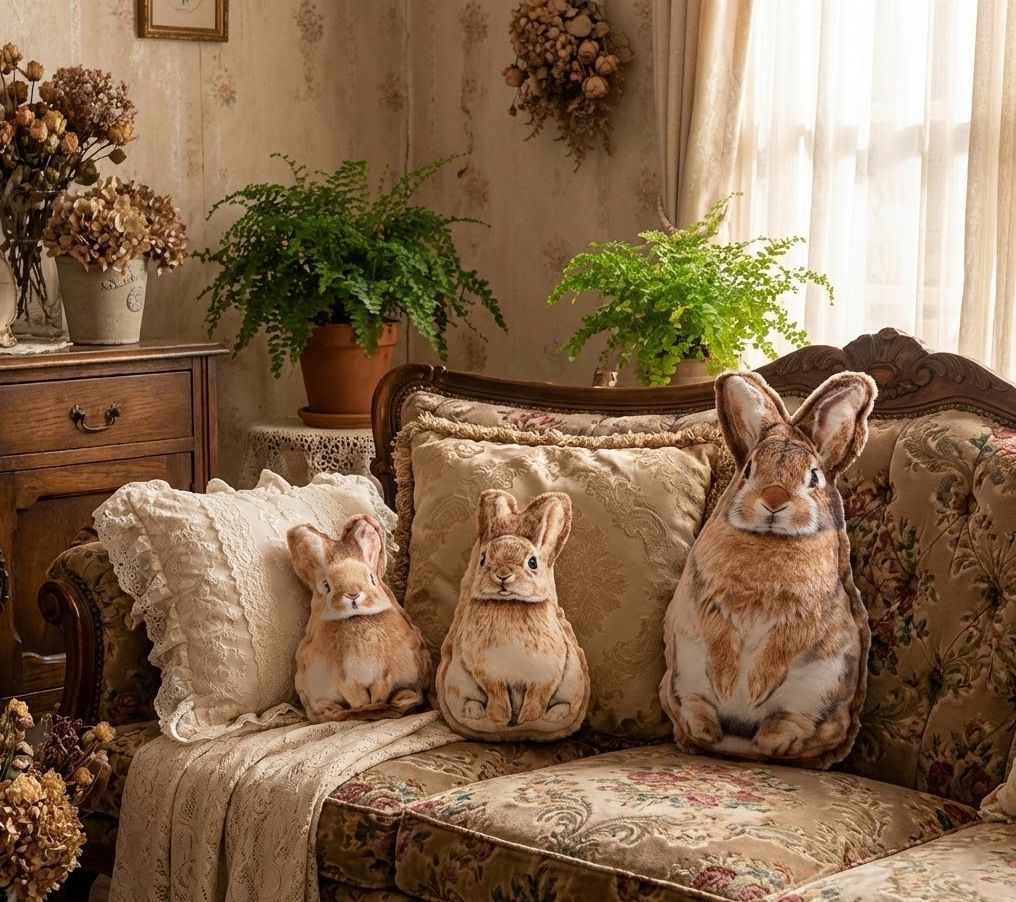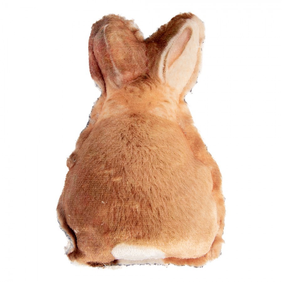 Roztomilý design: Tvarovaný polštářek s věrným potiskem králíka.