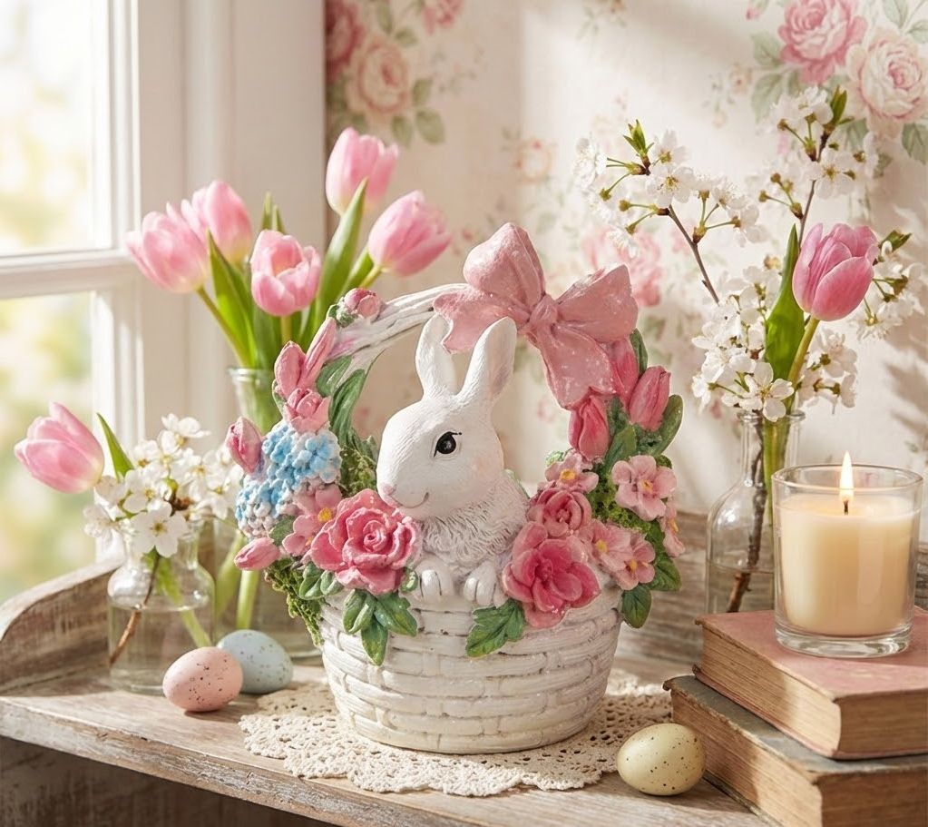Kouzelná jarní dekorace: bílý králíček vykukující z košíku plného růžových a modrých květů. Romantický styl s velkou mašlí. Rozměr 15×9×16 cm.