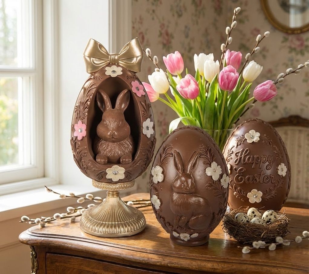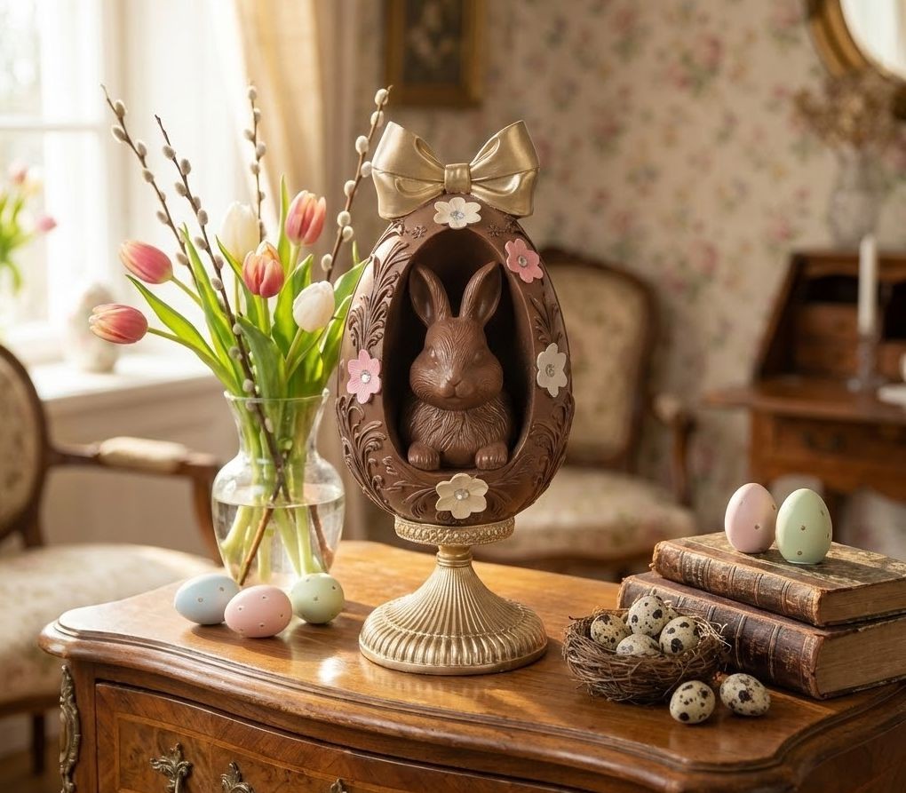 Přineste do svého domova kouzlo Velikonoc s touto jedinečnou vintage dekorací. Nádherné vajíčko ve věrné imitaci pravé mléčné čokolády, které ve svém nitru skrývá roztomilého králíčka, se zaručeně stane středobodem vaší jarní výzdoby.