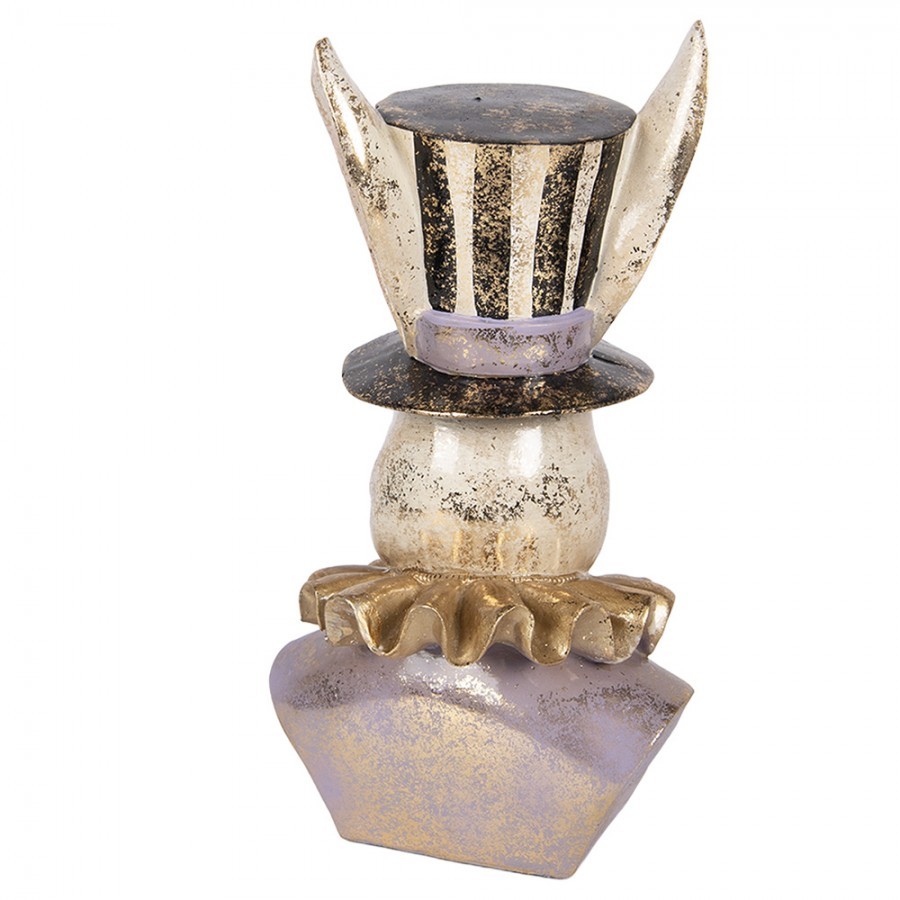Tato dekorace v sobě spojuje nostalgii starých časů s hravou extravagancí. Zajíc je zachycen v póze váženého gentlemana – na hlavě má pruhovaný cylindr, krk mu zdobí bohatý zlatý límec (žabó) a oděn je do saka v jemném fialovo-šedém odstínu.