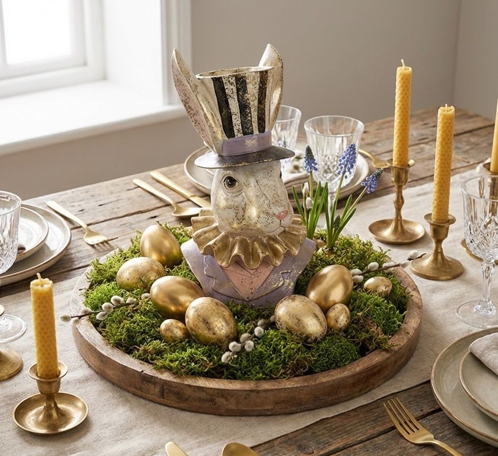 Velikonoční stůl: Umístěte králíka do středu stolu na dřevěný podnos, obklopte jej mechem a několika zlatými vajíčky pro vytvoření luxusního svátečního zátiší.