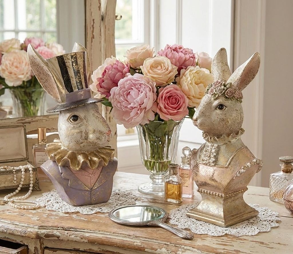 Vneste do svého interiéru špetku kouzla z říše divů a starosvětské elegance. Tato majestátní busta zajíce ve fraku a cylindru není jen obyčejnou velikonoční ozdobou, ale skutečným uměleckým dílem. Díky své výrazné zlaté patině a propracovaným detailům se stane nepřehlédnutelnou dominantou každé místnosti.