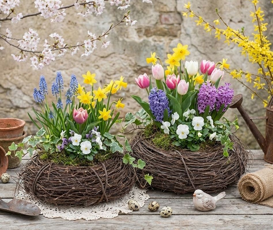 Díky svému designu můžete tento květináč snadno umístit na stůl, parapet nebo terasu, kde rozzáří vaše jarní aranžmá.