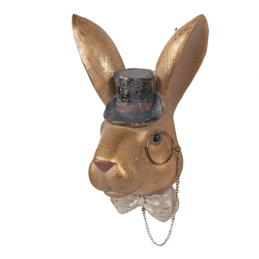 Oživte svůj interiér originální nástěnnou dekorací hlavy hnědého zajíce. Elegantní králík s cylindrem, monoklem a motýlkem vnese do vašeho domova pohádkové kouzlo. Snadné zavěšení, rozměry 17x11x25 cm.