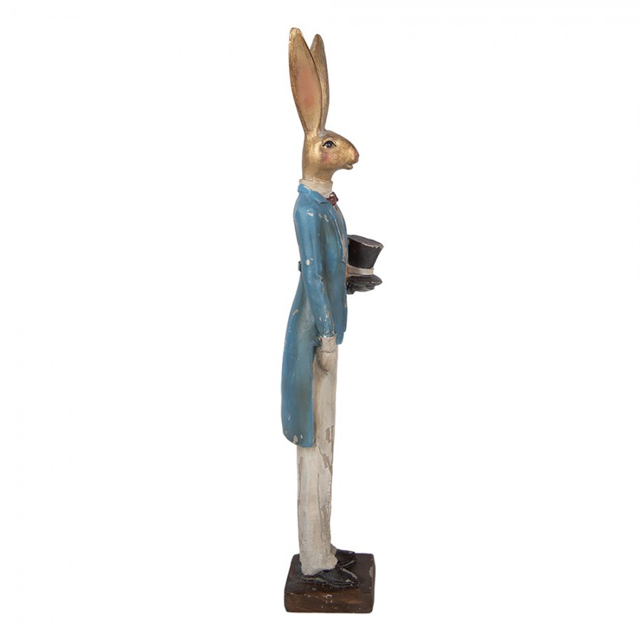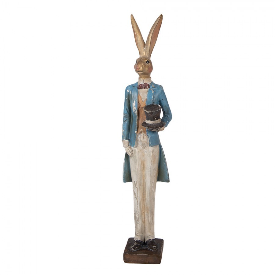 Tato stylová figurka zajíce je vyrobena v antikvárním stylu s důrazem na detail a texturu. Zaječí elegán je oblečen do modrého fraku, světlé vesty s motýlkem a bílých kalhot. V ruce nonšalantně drží černý cylindr.