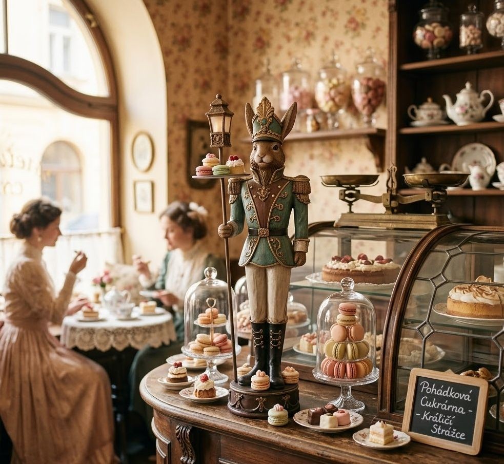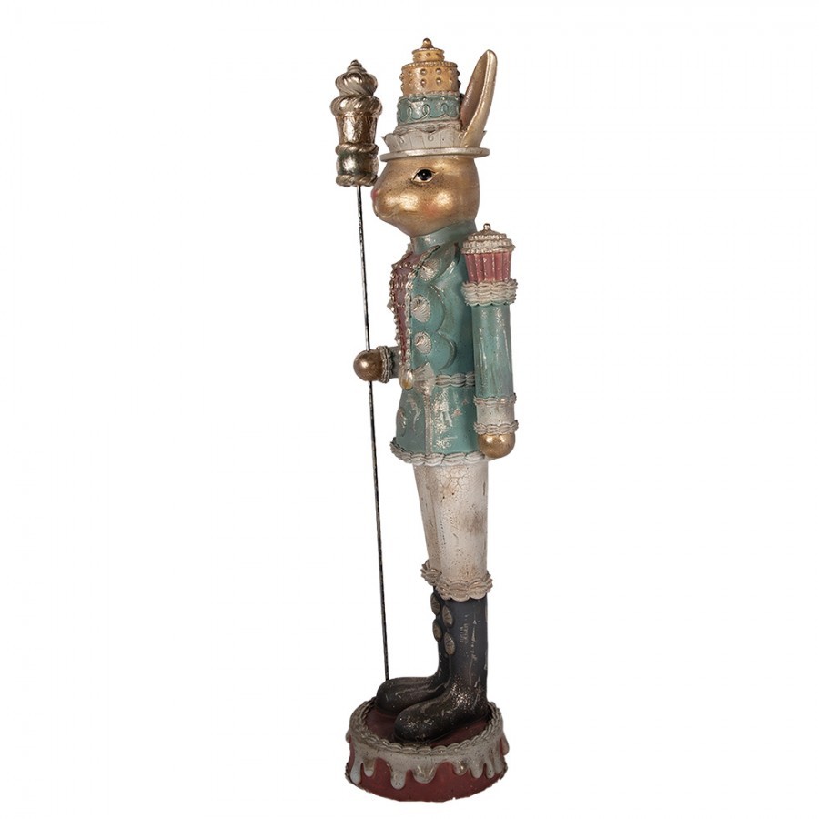 Pohádkový design: Králík je elegantně oděn do propracovaného uniformního kabátce s bohatým zdobením, výraznými epoletami na ramenou a vysokými jezdeckými botami.